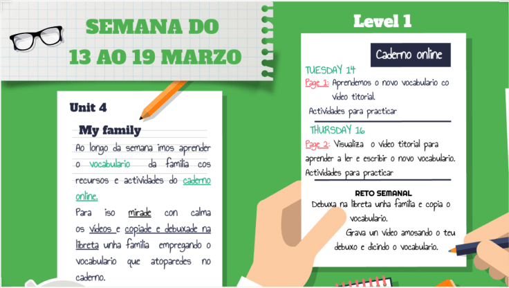 Cada un de vós ten que elaborar un mural con debuxos ou fotos dos distintos membros da familia. Debaixo de cada un deles tendes que escribir unha presentación (acordádevos que para presentar a alguén dicimos THIS IS MY…..) e cando o teñades rematado, gravar un pequeno vídeo para presentarnos a mín e ao resto dos compañeiros ás vosas familias