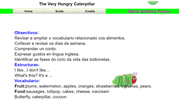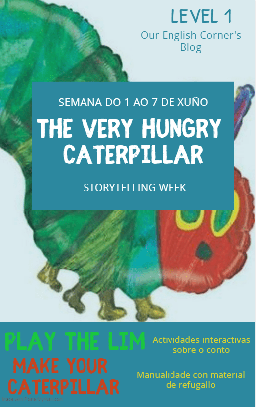 Esta semana imos adicarlla a un dos meus contos favoritos “The Very Hungry Caterpillar” de Eric Carle. Gracias a esta oruga glotona imos aprender algo máis sobre comidas e como expresar os nosos gustos, así como repasar os días da semana.