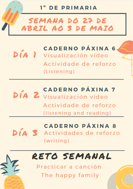 Iniciamos unha nova semana agardando que todos estedes ben. Lede con atención o plan da semana. As actividades van pautadas para facilitar que vos organicedes mellor pero se alguén quere distribuir o traballo doutro xeito non hai problema ningún. Vós sodes os que tendes que adaptar os tempos de traballo ás ciscunstancias da casa (dispoñibilidade de equipo informático, axuda dos vosos pais, outras actividades,…)