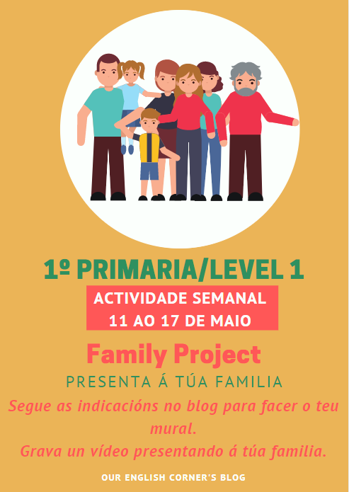 Cada un de vós ten que elaborar un mural con debuxos ou fotos dos distintos membros da familia. Debaixo de cada un deles tendes que escribir unha presentación (acordádevos que para presentar a alguén dicimos THIS IS MY…..) e cando o teñades rematado, gravar un pequeno vídeo para presentarnos a mín e ao resto dos compañeiros ás vosas familias