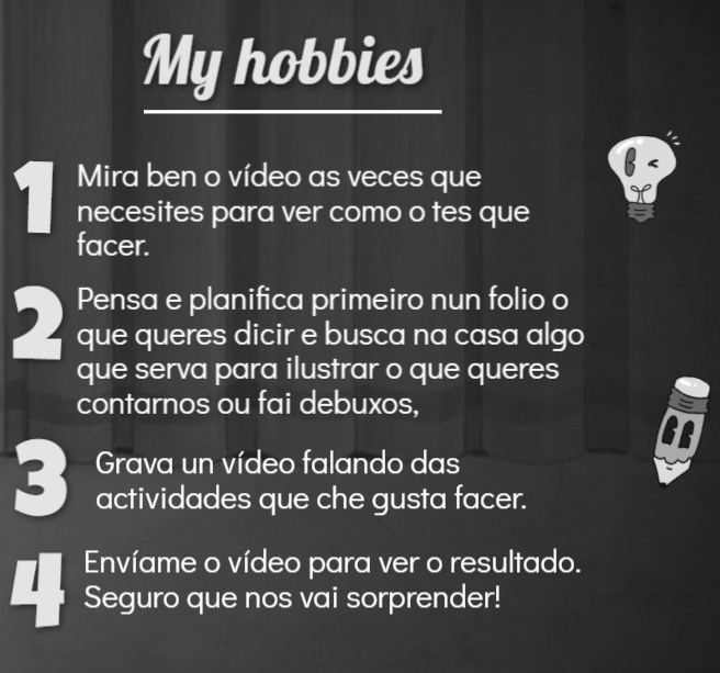Un consello:cando as teñades feitas volvede a escoitar o vídeo para comprobar as vosas respostas.
