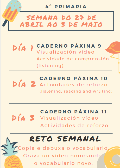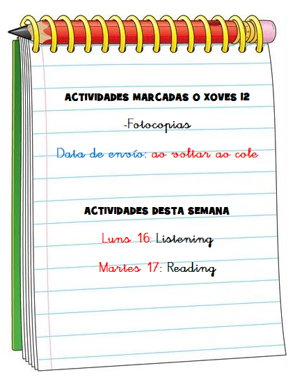 Non vos esquezades do reto semanal. Copiade e debuxade na libreta o novo vocabulario. Enviade un vídeo contándome as vosas rutinas diarias.