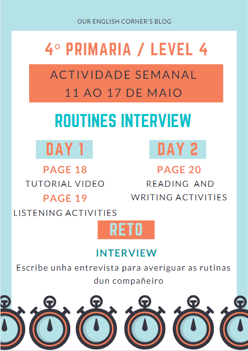 Esta semana ímonos dedicar a aprender a preguntar polas rutinas. Escoitade o vídeo que preparei todos os días antes de facer as actividades para refrescar o que imos aprendendo. É moi doado así que ….Let’s go!