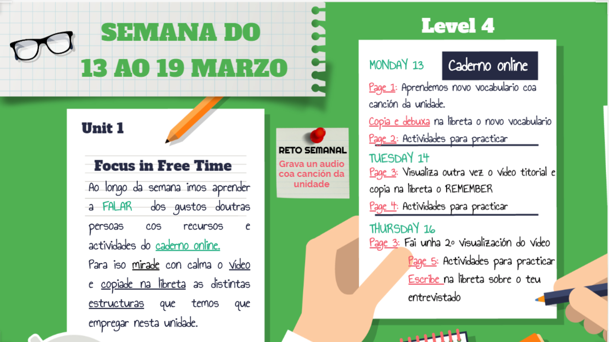 Hoxe imos a ver un vídeo onde vos explico como falar das rutinas doutra persoa na páxina 26. Escoitade con calma as miñas explicacións e anotade na libreta o remember. Facede as actividades da páxina 27 con calma e revisádeas antes de mandar a ficha. Escoitade o trabalinguas e practicade porque vai ser o reto semanal.