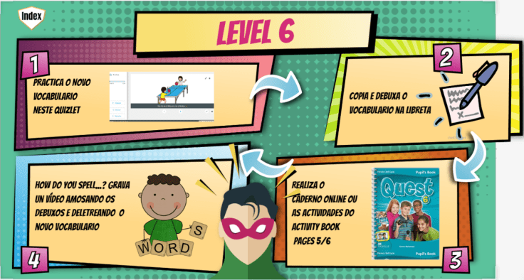 A seguinte proposta de actividade é un caderno personal online onde atoparedes a historia da páxina 5 do Class Book e os exercicios das páxinas 5 e 6 do Activity Book. Cada un ten un usuario e contraseña para acceder ao caderno que podedes atopar no cadro de abaixo. Preferiblemente realizade as actividades de xeito online para facilitar o envío e a corrección. Non é para facelas todas de seguido. Cando rematedes cada ficha seleccionade TERMINADO e seguide noutro momento.