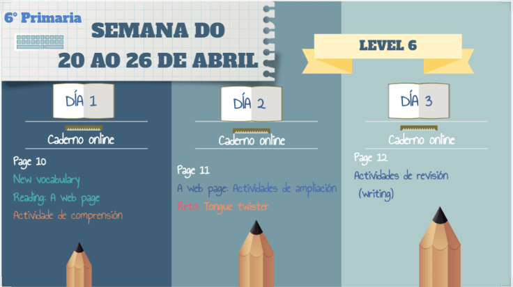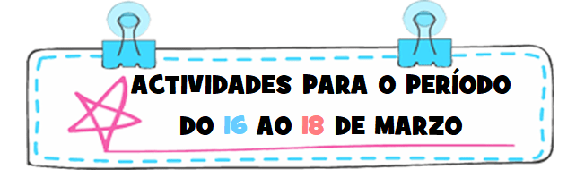 Iniciamos unha nova semana agardando que todos estedes ben. Lede con atención o plan da semana. As actividades van marcadas segundo os días contrplados no calendario escolar nos que temos clase para facilitar que vos organicedes mellor pero se alguén quere distribuir o traballo doutro xeito non hai problema ningún. Vós sodes os que tendes que adaptar os tempos de traballo ás ciscunstancias da casa (dispoñibilidade de equipo informático, axuda dos vosos pais, outras actividades,…)
