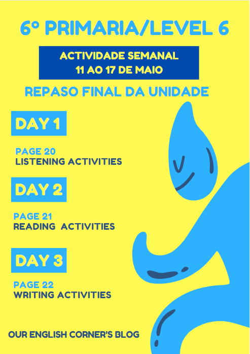 Esta semana imos facer unha revisión final do tema. Na páxina 20 do caderno tendes unha actividades de listening. Revisade antes de mandarma posto que desta volta so tendes unha oportunidade.