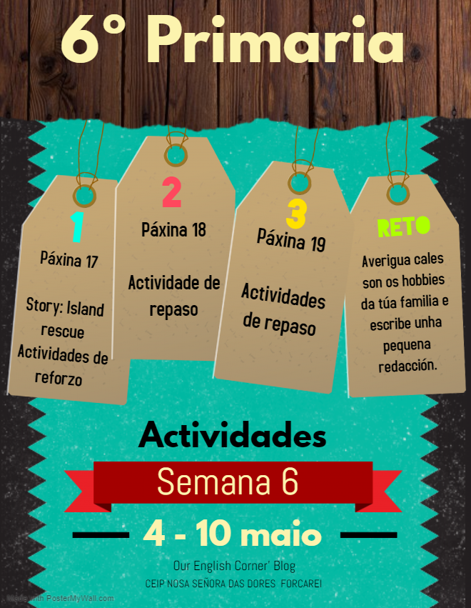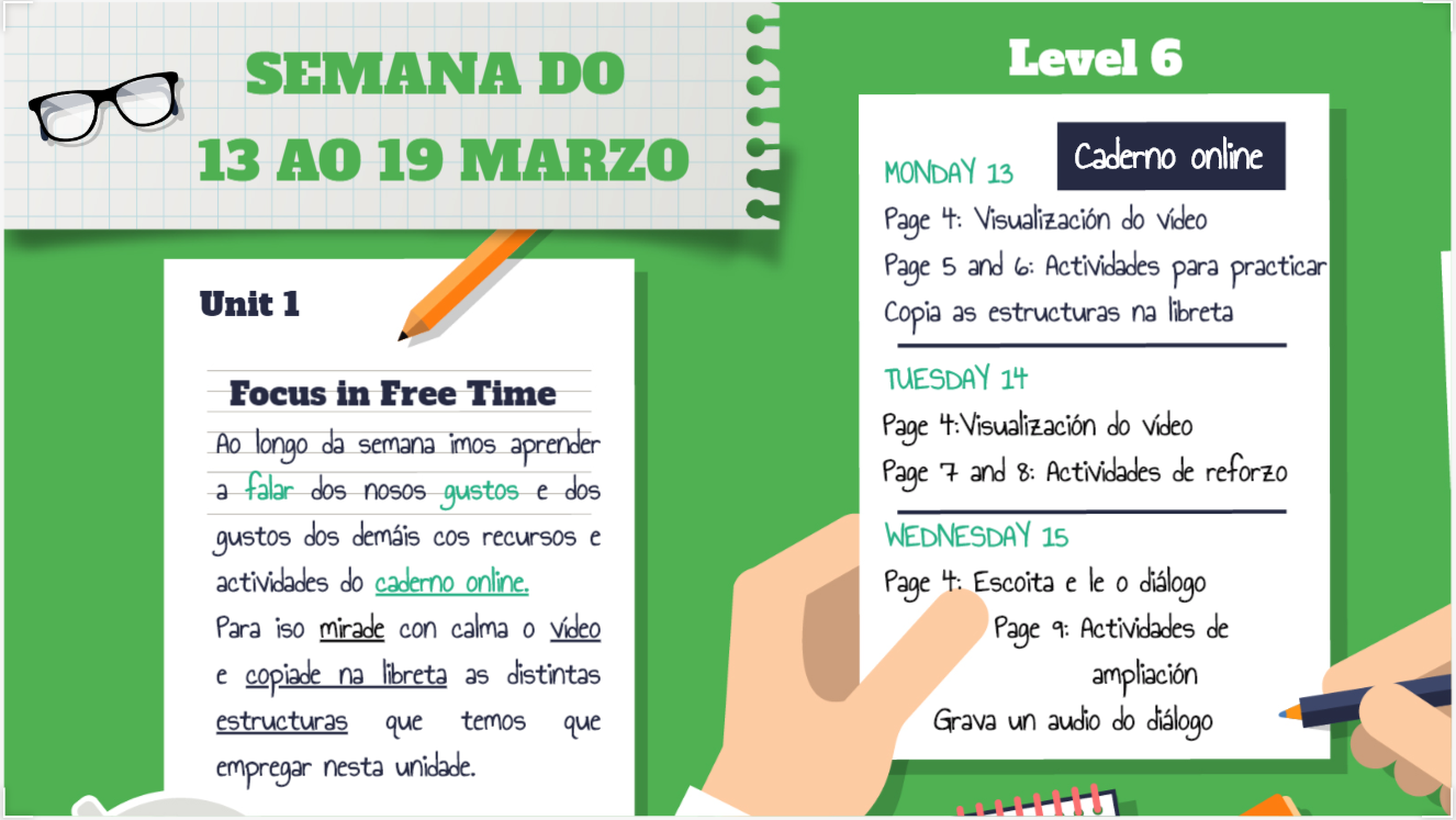 A seguinte proposta de actividade é un caderno personal online onde atoparedes a historia da páxina 5 do Class Book e os exercicios das páxinas 5 e 6 do Activity Book. Cada un ten un usuario e contraseña para acceder ao caderno que podedes atopar no cadro de abaixo. Preferiblemente realizade as actividades de xeito online para facilitar o envío e a corrección. Non é para facelas todas de seguido. Cando rematedes cada ficha seleccionade TERMINADO e seguide noutro momento.