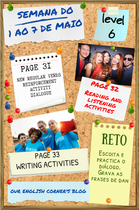 Hoxe na páxina 31 imos aprender novos verbos e practicar o speaking cun diálogo. Escoitade e repetide as frases de DAN. Revidade o exercicio antes de mos mandar e, por favor, mirade o vídeo as veces que faga falta.